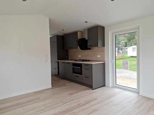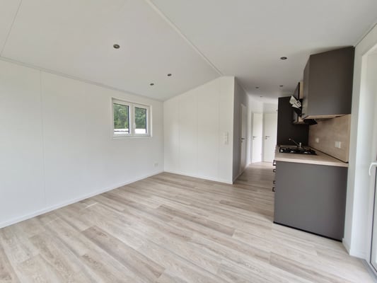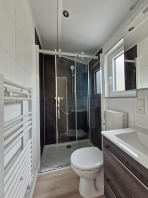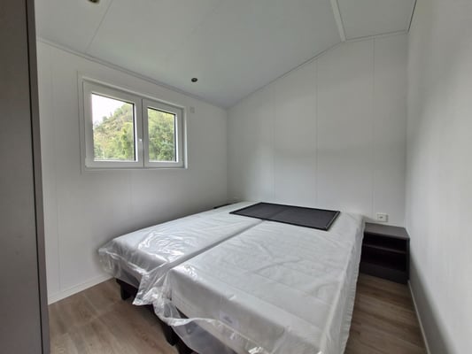Partiellement meublé, espace de vie complètement vide avec 2 chambres à coucher, Rigid-Click-Vinyl avec effet bois Hatting Oak, toit en tuiles en acier, double pente gris graphite, bardages en PVC Viny Plus Shadow Jura Pine, epaisseur parois 100mm isolées avec des panneaux de laine minérale, epaisseur toit et sol 200mm isolées avec des panneaux de laine minérale, portes et fenêtres en anthracite à l’extérieur et en blanc à l’intérieur, porte d’entré et fenêtre de la salle de bain entièrement en verre dépoli, moustiquaires et volets roulants électriques en anthracite dans les deux chambres à coucher, gouttières et descentes en anthracite, plafond intérieur pointu blanc avec hauteur intérieure sur les côtés longs 2.185m et centre 2.60m, parois intérieurs dans toutes les pieces en Crystal White, parois intérieurs dans la salle de bain blanc, douche en Lentini Dark, portes intérieures en blanc lisse avec poignée de porte en optique V2A.