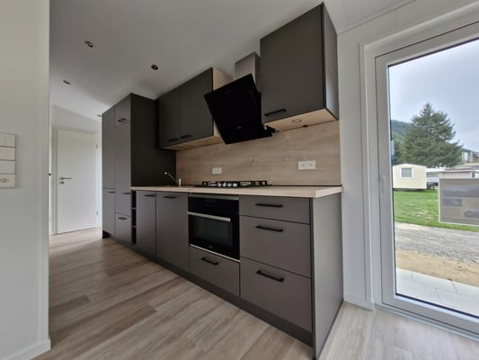 Frigo avec congélateur séparé, plaque de cuisson à gaz 4 feux et hotte aspirante (évacuation d’air), four compact à micro-ondes, lave-vaisselle, couleur du caisson, plan de travail et paroi arrière de la niche en chêne Montréal, salle de bain avec douche, lavabo et meuble bas avec 2 tiroirs, armoire haute 3 portes gris onyx dans la chambre à coucher des parents, les deux chambres avec 2x 80/200cm resp. 1x 80/200cm Mystery Box anthracite, chauffe-eau à gaz Vaillant, prises Suisses, prises pour lampe et courant extérieure.